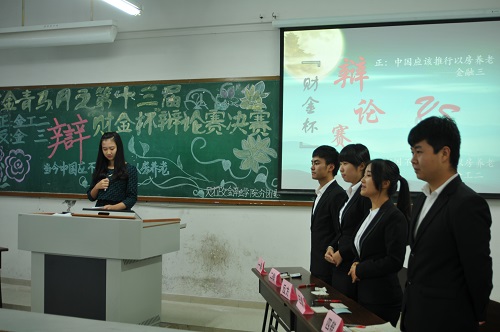 比赛开始,双方从国情、人情、法律制度等方面进行概括立论,试图抢下先机。随后的盘问驳论环节中,正方以老人情感的感性角度入手占理,反方则以房价虚高这一经济现象予以还击,双方辩手灵敏的思维和严谨的逻辑给现场观众留下深刻印象。自由辩论中涌现出的“政府负担”、“金融风险”等名词展现了双方专业的知识素养。各自总结陈词后,财金辩论队在评分空隙给观众带来了一场诙谐而精彩的辩论赛表演,让大家充分感受到辩论的魅力。