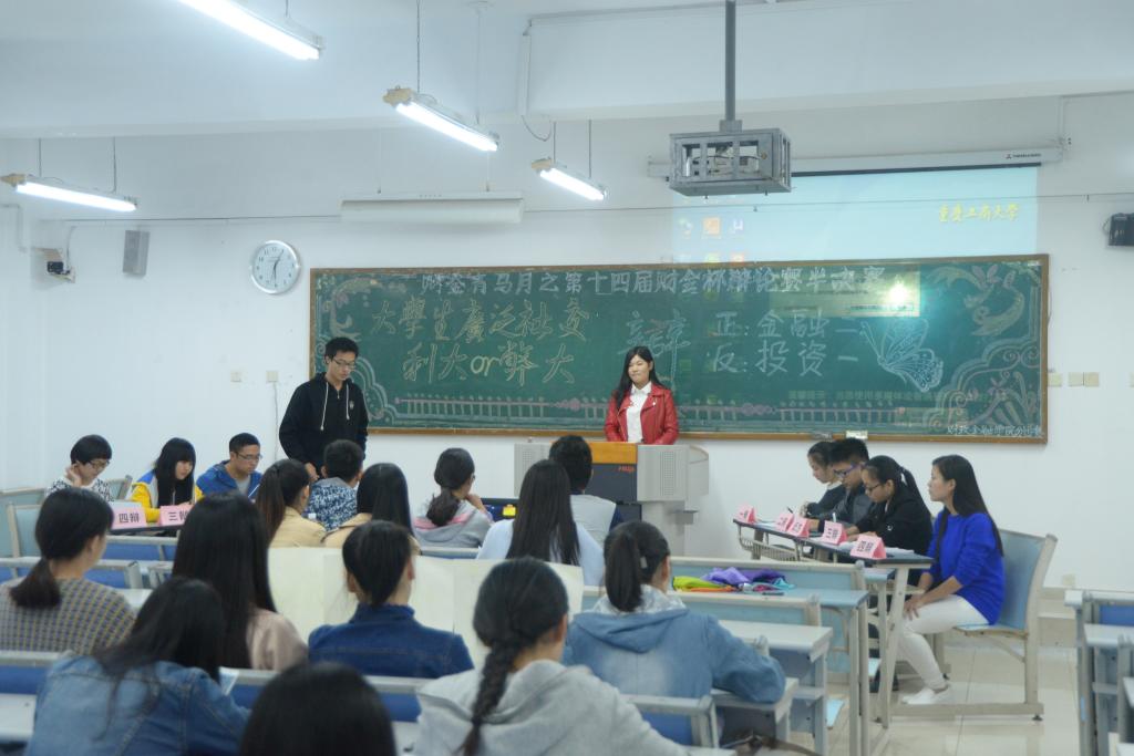 经双方自我介绍后,两场言语之间的硝烟战火打响。两场辩论赛的正方均打出培养社交能力是老员工需面对的也需提高的社会能力,就其重要性简洁明了地阐述了自己的观点;同时投资一班、金融六班所代表的反方从广泛社交会影响学习,消耗精力,减少专业研究时间等不利结果反驳,通过“广泛社交之人如无水之鱼,无根之木”、“横向的宽度必然会导致纵向的不足”等论据进行一一剖析。在唇枪舌战中,气氛被推向高潮,观众的心也一步一步被抓紧。到驳论与自由辩论环节,双方更是针锋相对,一方提问紧逼,一方也答辩巧舌如簧,一问一答,一辩一争,无不体现其思维的敏捷