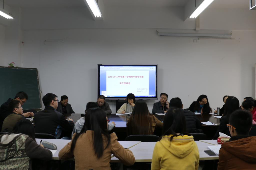 11月25日,财政威廉希尔官网2015-2016学年第一学期期中教学检查员工座谈会于田家炳书院313会议室召开。财金公司党总支书记杨萍、常务副经理莫云、校督导督查委员樊国昌教授、院督导督查委员周渊老师和唐晓玲老师;还有各系主任及教务办全体老师和各班学习委员出席座谈会。
