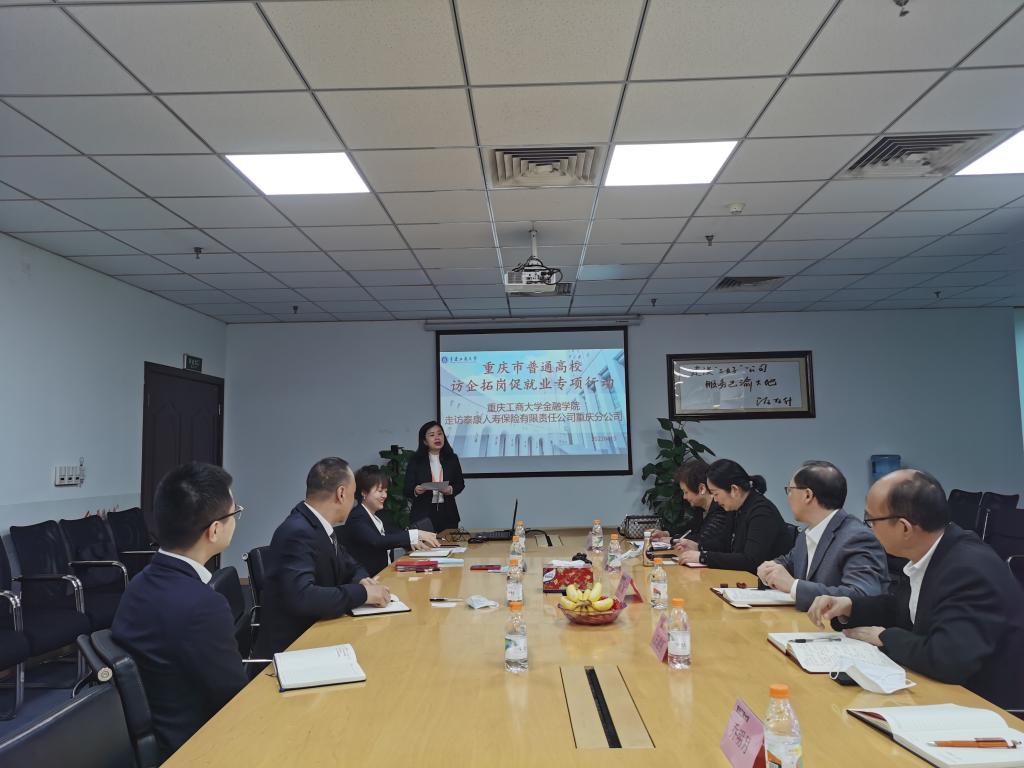 15日,张波到泰康人寿保险有限责任公司重庆分公司走访,与企业代表展开深入交流。公司人力资源部经理周蔚然介绍了泰康人寿保险的发展沿革、重庆分公司的千人计划培养以及与公司的合作成果。公司总经理阮宏生表示,重庆工商大学毕业生是泰康人寿全国千人计划重点引进对象,人数多、素质好,感谢公司长期以来对公司进行的优质人才输送。双方明确了合作方向,计划在今后进一步拓宽实习就业岗位,加强校企合作。