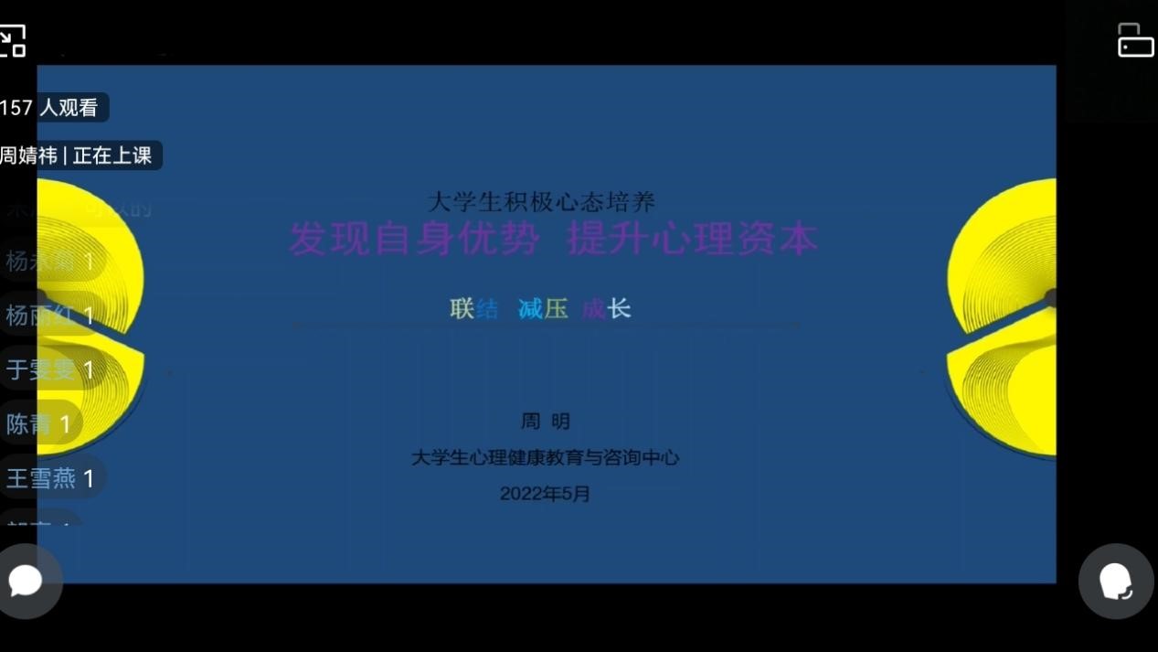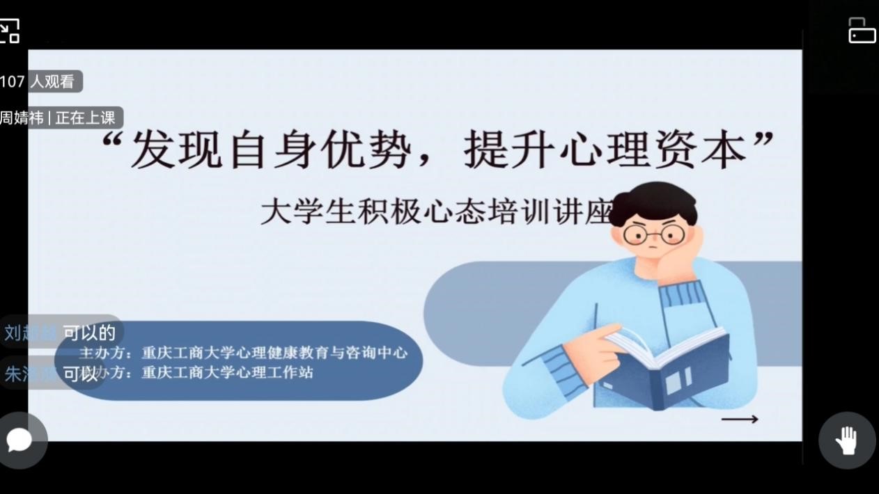 2022年5月25日中午12点,由重庆工商大学心理健康教育与咨询中心主办,威廉希尔官网心理工作站承办的“发现自身优势,提升心理资本”心理培训讲座于企业微信线上平台顺利举办。此次讲座邀请到了公司心理健康教育与咨询中心周明老师作为主讲人,讲座内容丰富、寓教于乐,受到了同学们的热烈欢迎。