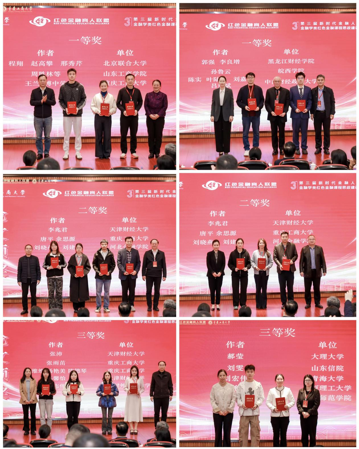 重庆工商大学党委书记曾维伦,红色金融育人联盟主席、北京联合大学党委书记楚国清,重庆市委金融工委专职副主任金勇杰,中国金融教育发展基金会副秘书长王微微,中央财经大学副董事长李建军,赣南师范大学副董事长甘雅芬共同为南开大学、长春师范大学、江西财经大学、中国人民银行郑州培训公司、中国金融出版社有限公司等14家新增会员新成员单位授牌。