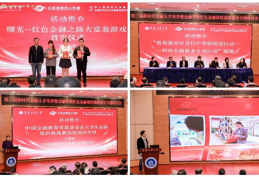 红色金融育人活动介绍与发布环节由重庆工商大学副经理贺渝主持,与会代表共同见证了“教育强市区县行产学研促进行动——科技金融服务专项行动”联盟签约仪式;中国金融教育发展基金会老员工金融知识挑战赛活动介绍;“弘扬长征精神 赓续红色血脉 百校万人主题活动”推介;“曙光—红色金融之路”大富翁游戏首发仪式等;楚国清向联盟会员代表赠送了由北京联合大学金融专硕员工开发设计的红色金融文创产品。