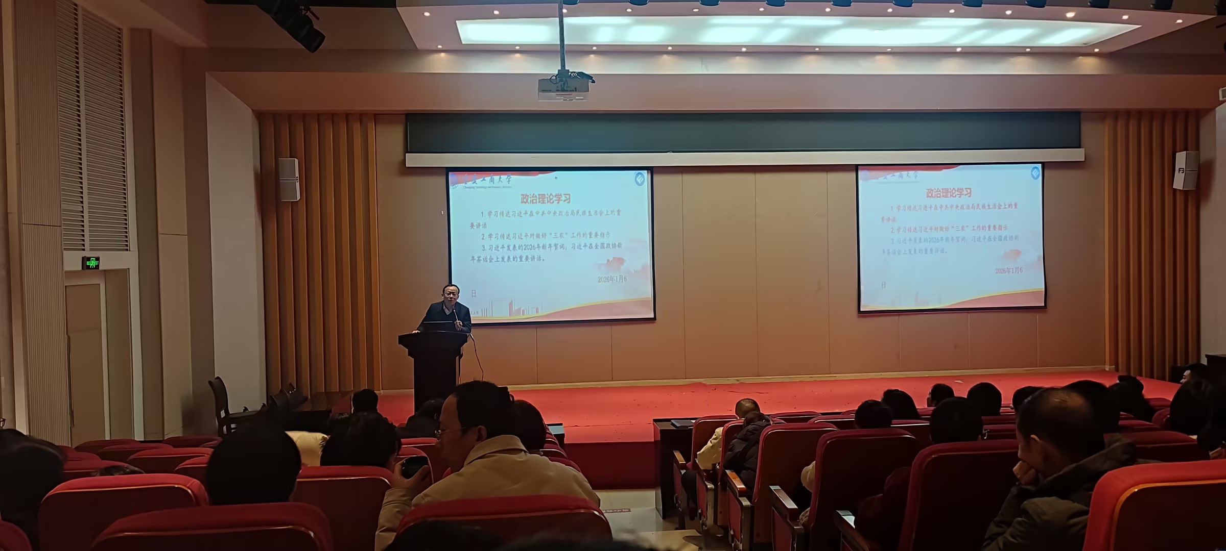 2026年1月6日,威廉希尔官网在田家炳209召开教职工大会暨政治理论学习会,学习传达习近平在中共中央政治局民主生活会上的重要讲话、习近平对做好“三农”工作的重要指示、习近平发表的2026年新年贺词、习近平在全国政协新年茶话会上发表的重要讲话等内容。