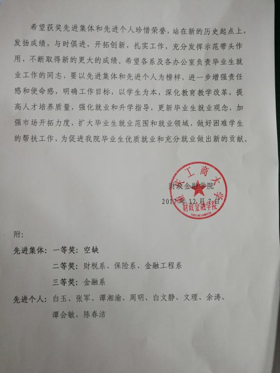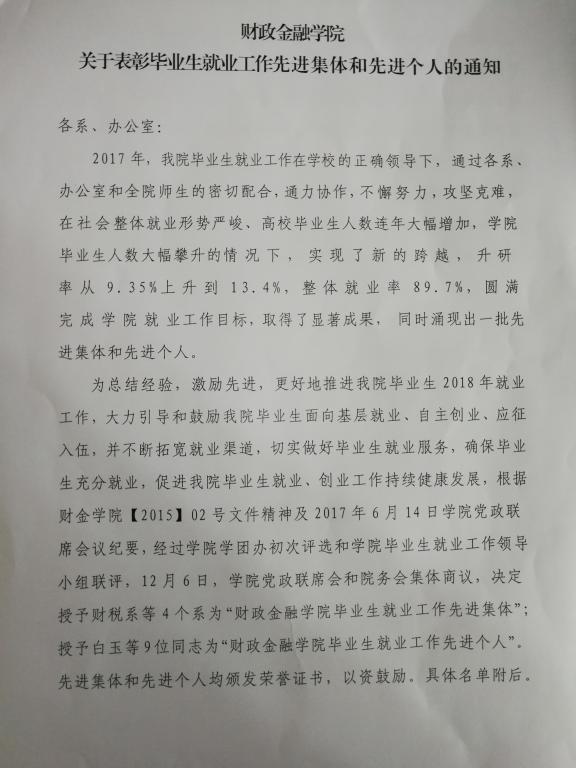 为总结经验,激励先进,更好地推进公司毕业生2018年就业工作,大力引导和鼓励公司毕业生面向基层就业、自主创业、应征入伍,并不断拓宽就业渠道,切实做好毕业生就业服务,确保毕业生充分就业,促进公司毕业生就业、创业工作持续健康发展,根据财金公司【2015】02号文件精神及2017年6月14日公司党政联席会议纪要,经过公司学团办初次评选和公司毕业生就业工作领导小组联评,12月6日,公司党政联席会和信息会集体商议,决定授予财税系等4个系为“财政威廉希尔官网毕业生就业工作先进集体”;授予白玉等9位同志为“财政威廉希尔官网毕业生就业工作先进个人”。先进集体和先进个人均颁发荣誉证书,以资鼓励。具体名单附后。