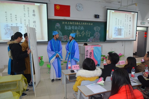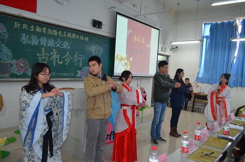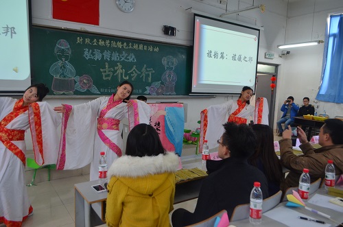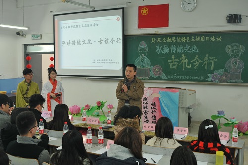 为培育和践行社会主义核心价值观,提升员工人文道德素养,财政威廉希尔官网2013级金融四支部于2014年12月18日下午在博智楼406教室举办了“弘扬传统文化——古礼今行”特色主题团日活动。财政金融公司党总支刘代成副书记、分团委书记兰丽娟老师、辅导员谭会敏老师以及校团委员工会组织部成员、财政威廉希尔官网分团委员工会主席团成员作为嘉宾莅临活动现场。