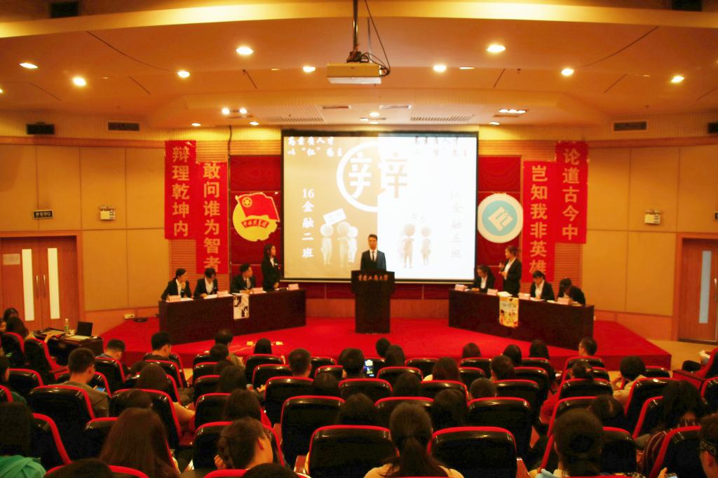 场上正方16金融二班的辩手以“高素质人才以仁为主”为辩题,而反方16金融五班的辩手以“高素质人才以智为主”为辩论。双方辩手你来我往,互不相让,针锋相对,为大家呈上了一场精彩刺激的比赛。首先双方一辩分别就自己的辩题进行立论陈词,在盘问环节双方就“当代老员工是不是人才”这一论点滔滔不绝。第一个比赛高潮出现在攻辩环节,双方以乔布斯为例纷纷阐述本方立场观点,一时间场上剑拔弩张,气氛十分紧张。在接下来的自由辩论环节,正反方又以军队作战为例进行了一场语言搏杀。最后,辩论在和谐却也不乏浓烈的气氛中结束。