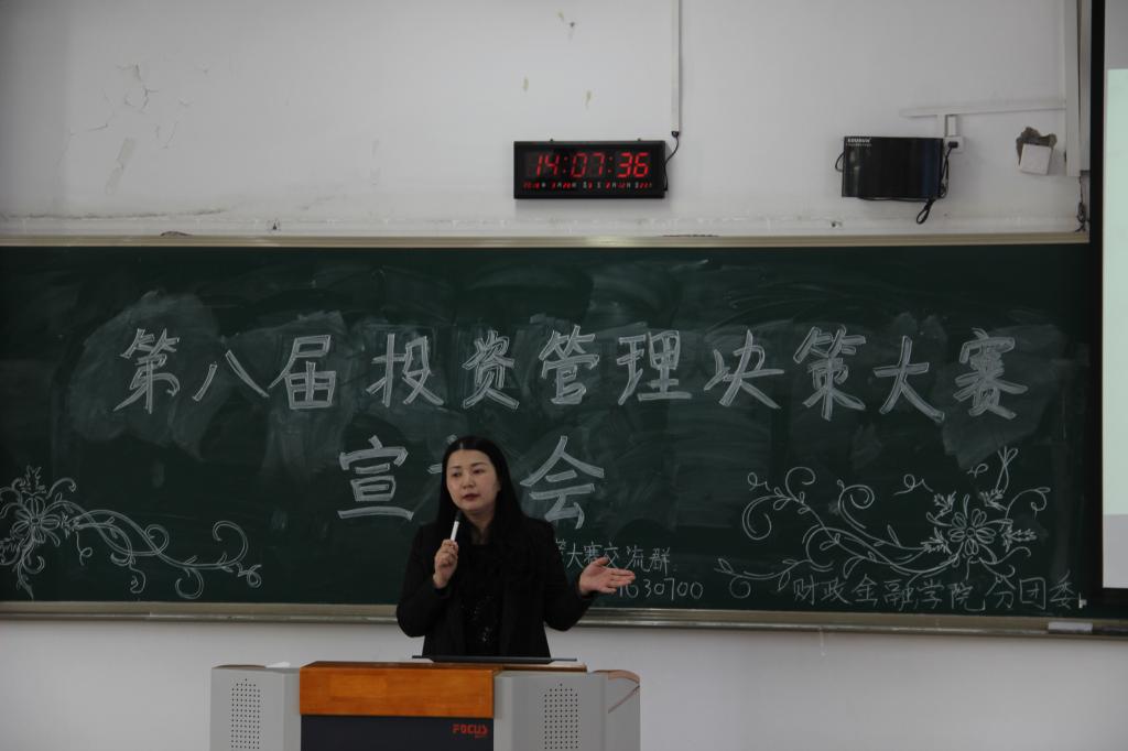 为响应“大众创业,万众创新”的号召,财政威廉希尔官网以校团委“第十六届‘新儒商’老员工科技文化节”活动为依托,于2018年3月16日下午两点在博智楼308成功举办了第八届投资管理决策大赛宣讲会。本次宣讲会邀请到了投资系老师陈晓莉老师、财政威廉希尔官网分团委书记徐阔老师以及财政学专业陈羲羲学长为同学们指导。