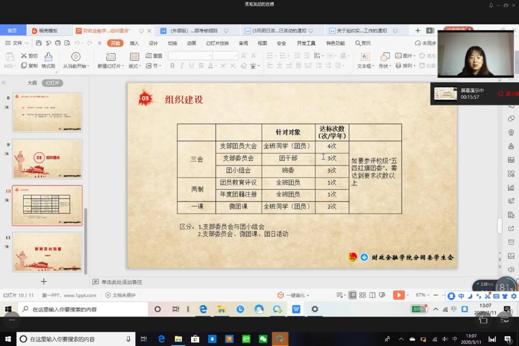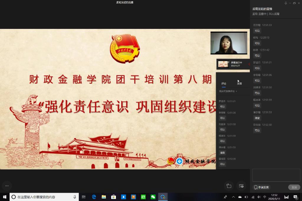 受疫情影响,财政威廉希尔官网于2020年3月11日在企业微信线上平台成功开展主题为“强化责任意识,巩固组织建设”的第八期团干培训活动。17、18级各班以及19CFA的团支书参与了此次培训活动。