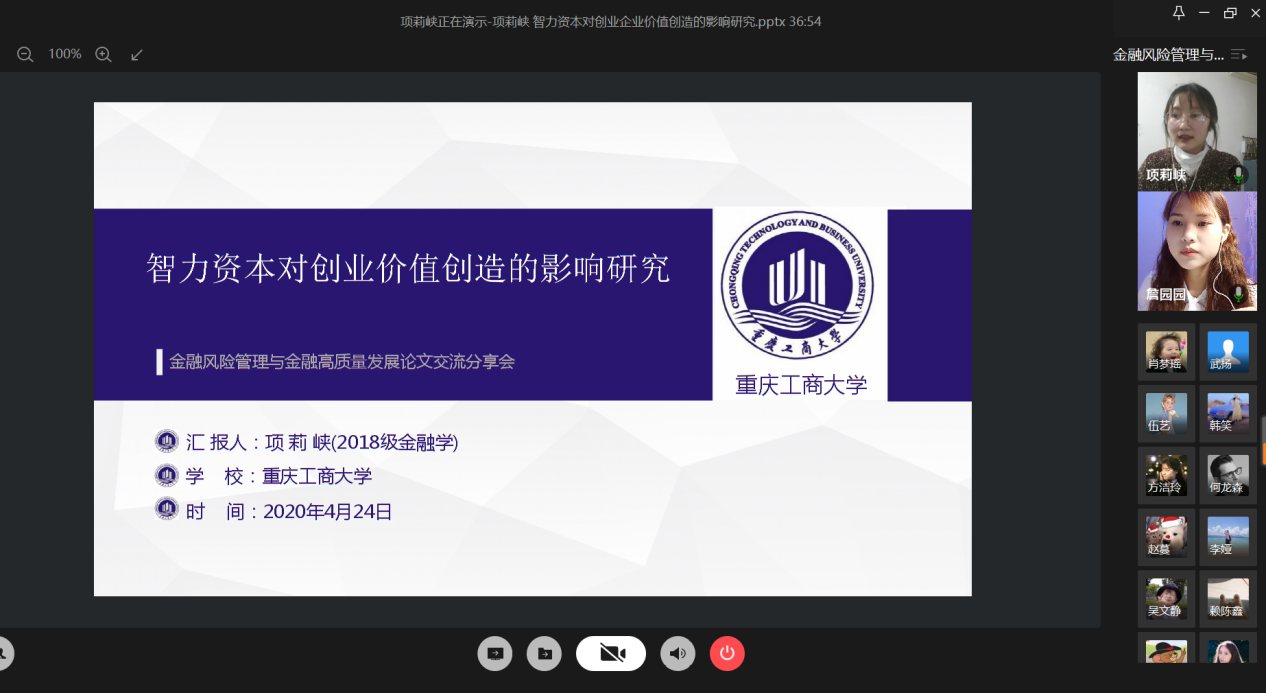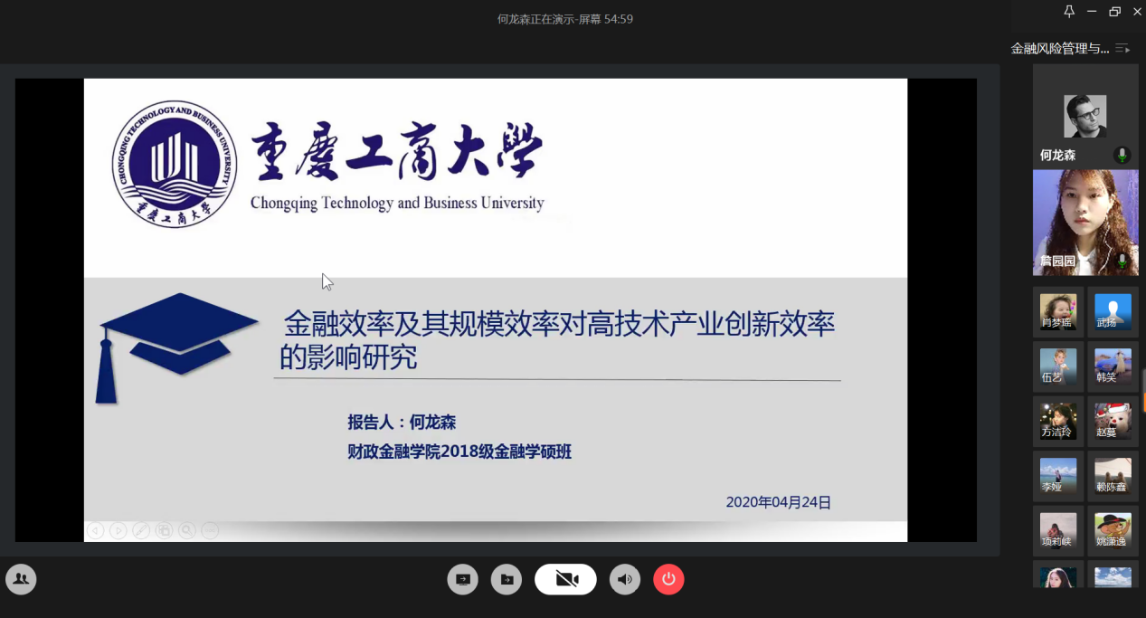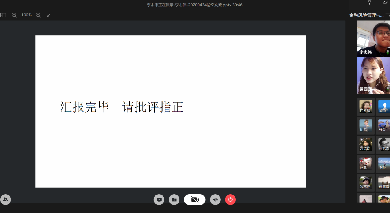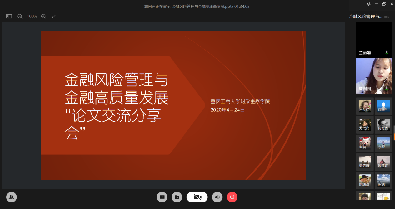 4月24日晚上,财政威廉希尔官网研究生分会通过腾讯会议成功举办了“金融风险管理与高质量发现”论文交流会。本次交流会由研分会的文体部部长詹园园主持,18级金融学硕的李志伟、项莉峡、何龙森、熊骁四位同学分享了他们的论文框架及论文写作经验。