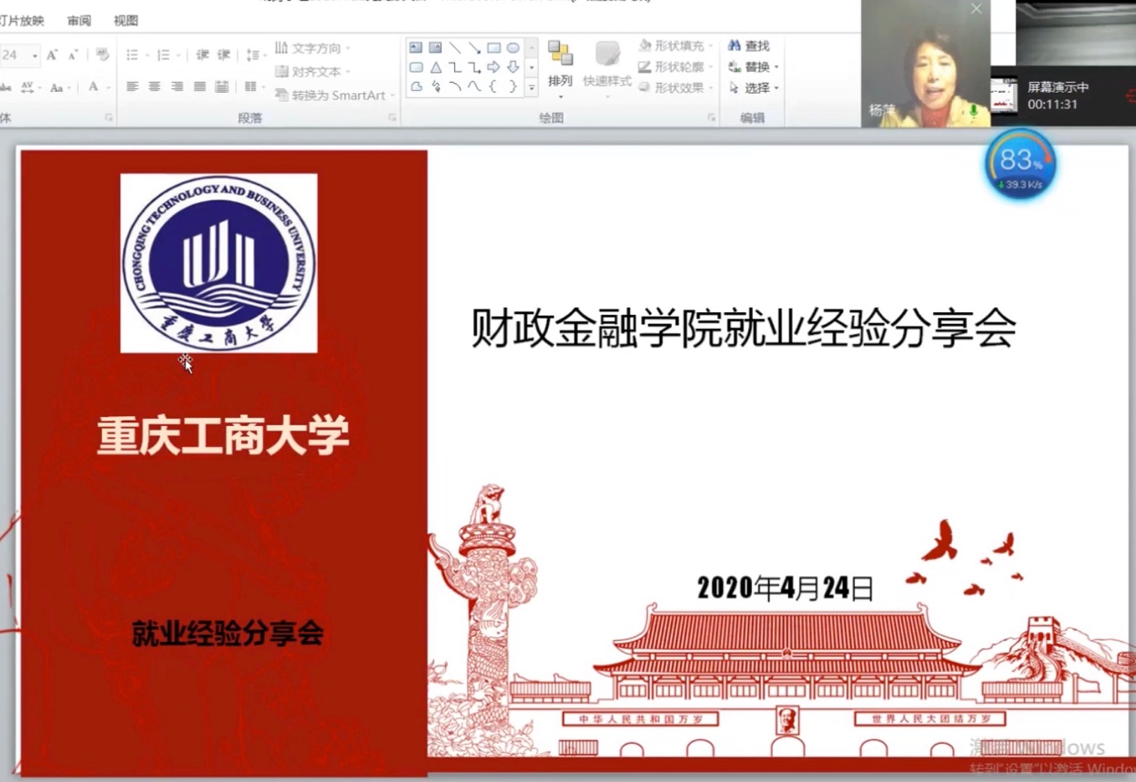 会议初始,财政金融公司党委书记杨萍教授致辞。她提到,目前疫情任未结束给求职以及备考的同学带来了极大挑战,公司十分关注同学们就业问题,殷切希望同学们能认真思考并选择职业,求职之前广泛积累经验之后能少走弯路并快速融入岗位。