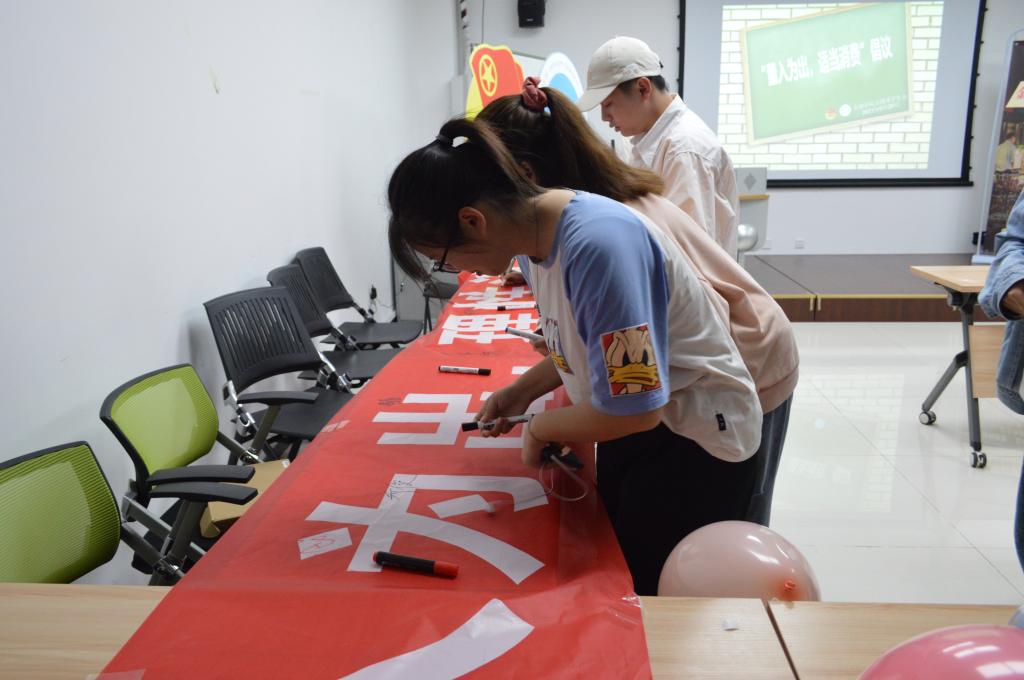 演出期间,主持人通过知识问答、分发问卷的方式向同学们传播消费知识。演出结束后,同学们分享身边发生的案例,提到了二手买卖脱离平台交易被骗、淘宝退款链接被骗、微信QQ被盗要求转钱被骗等。最后,威廉希尔官网分团委(员工)副书记田凯玉对活动进行了总结,再次普及金融防诈骗知识,同时倡导同学们量入为出,理性消费。活动结束后,同学们在横幅上签字响应正确消费的号召。