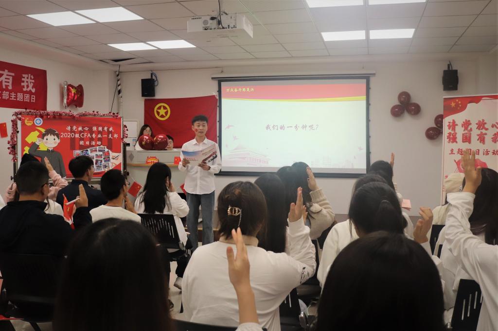 活动伊始,全体团员起立,合唱团歌,整齐嘹亮的歌声充分展现少年气魄。首先,诗朗诵《少年中国说》振奋全场,同学们带着激情昂扬的精神风貌,回顾巴黎和会的谈判与五四运动的爆发,感悟其中的使命与责任,同时通过连线老党员,体悟先辈拏云志,振奋红色精神。随后,一首《沁园春·雪》将磅礴的山河历史画卷徐徐展开;一条《中国一分钟》,把中国复兴之路的历程一一展现,同学们纷纷进行自己的一分钟分享,并邀请黎毅老师分享金融学子践行“请党放心 强国有我”铮铮誓言的生动实践。接着,同学们学习了习近平总书记“七一”重要讲话精神,重温习近平总书记对青年的寄语,紧扣中华民族伟大复兴的中国梦,分享写给未来自己的一封信。最后,全体起立进行庄严宣誓。“请党放心,强国有我!”铿锵有力的誓言响彻教室。