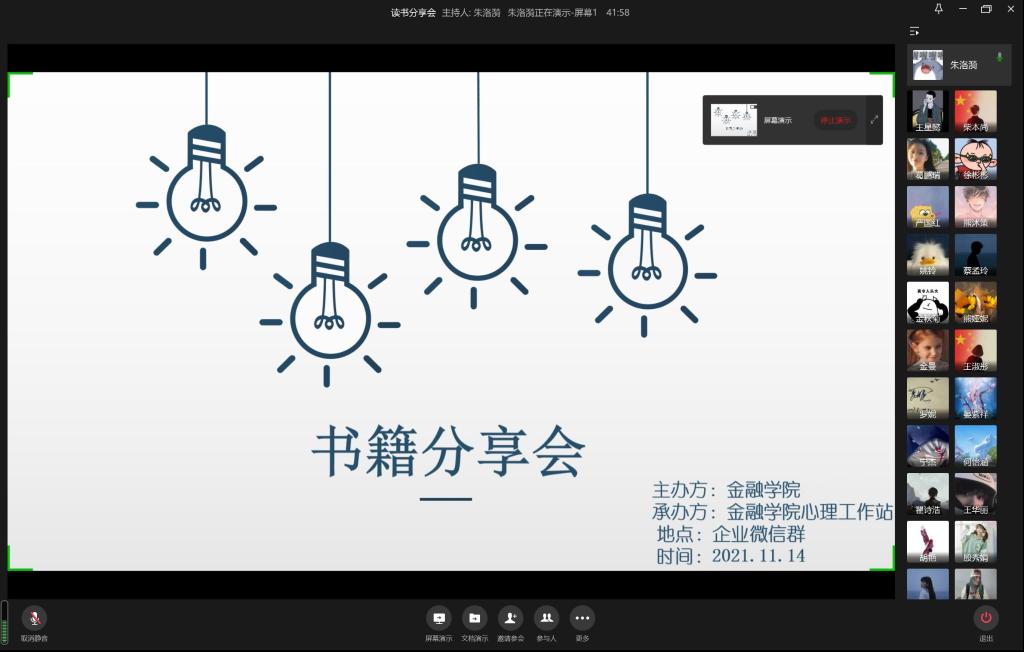 为了促进大公司园的文化氛围,提高同学们的学习积极性,加强良好的心理健康教育, 2021年11月14日下午两点,威廉希尔官网心理工作站举办的 “书籍分享会”线上活动在企业微信群如期进行。威廉希尔官网心理工作站工作人员、心理委员和多名员工参加了此次分享会。
