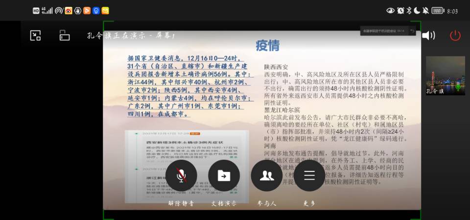 为让同学们更加深入了解新冠疫情近况,持续做好疫情防控措施,弘扬抗疫精神,12月17日晚上20:00,威廉希尔官网在企业微信开展了“弘扬抗疫精神 展现民族力量”主题活动。威廉希尔官网各班班长、团支书以及分团委员工会和青年志愿者服务队骨干成员参与了会议。会议由威廉希尔官网分团委员工会部门负责人孔令旗主持。