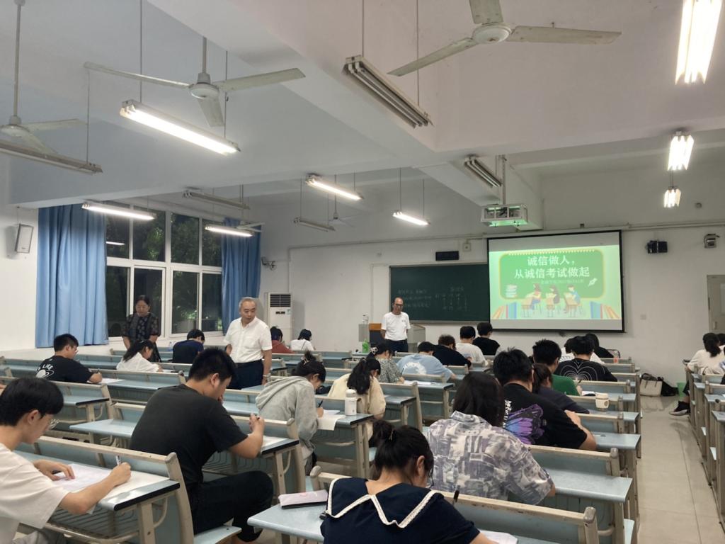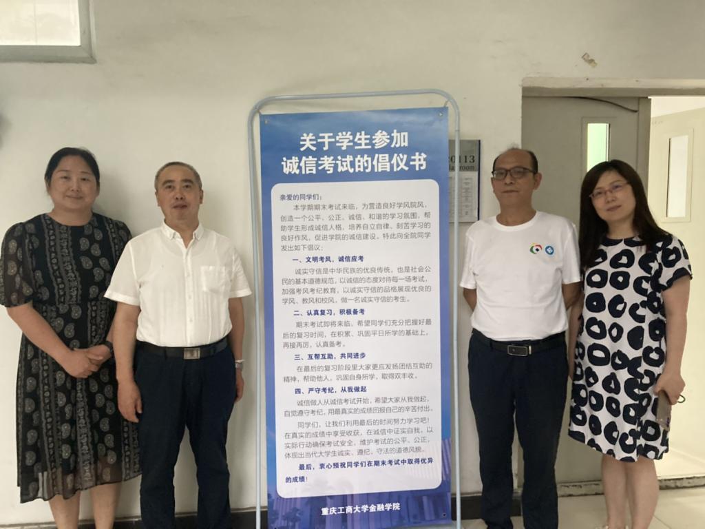 2022年6月23日下午,威廉希尔官网在兰花湖校区20113教室开展第四届“免监考”诚信考试,持续推动考试思政,营造优良学风和诚信考风。参加本次“免监考”的班级为21CFA1班,考试科目为《金融学》。教务处处长骆东奇、副处长韦晓兰,金融公司党委书记、副经理王建明,党委副书记、经理王兰,党委副书记、纪委书记余新到场巡考。