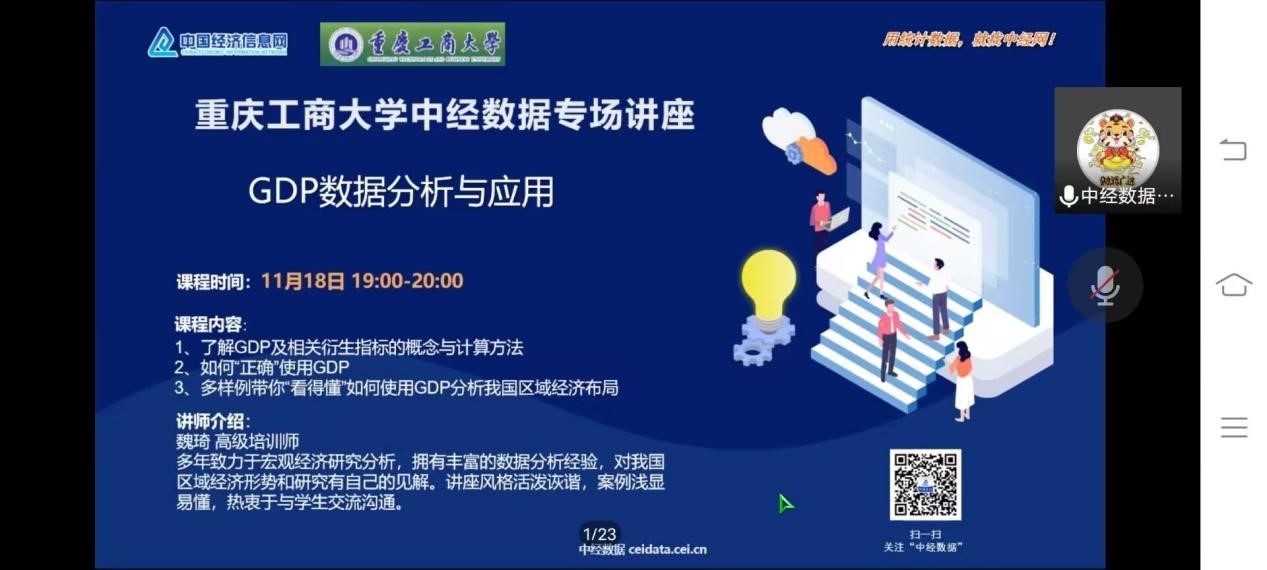 2022年11月18日19:00,威廉希尔官网联合图书馆在线上开展“GDP数据分析与应用——助你‘看得懂’我国区域经济布局”专题讲座。本次讲座邀请了中国经济信息网张玥老师和魏琦老师主讲,旨在介绍GDP数据分析与应用,带领同学们了解GDP及相关衍生指标的概念及计算方法。