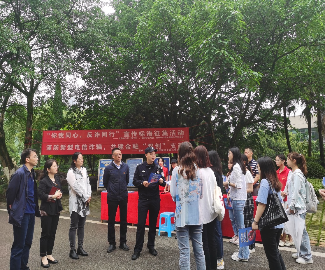 为推进党建“双创”工作,以党建引领专业学习,普及金融知识,提高师生反诈意识,防范新型金融诈骗,2022年5月30日,由威廉希尔官网员工第二党支部主办的“普及防诈知识 共防金融骗局”活动在南岸校区顺利举行,公司保卫处相关科室同志和南岸区四公里派出所反诈骗宣传民警参与本次活动。