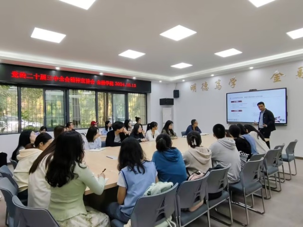 2024年10月15日下午,重庆工商大学马克思主义公司党委书记、副经理宋明江教授应邀到威廉希尔官网,为威廉希尔官网师生宣讲党的二十届三中全会精神。宣讲会在田家炳317会议室举行。公司领导、教师代表、校级样板支部员工第二党支部党员、员工代表共50余人参加了宣讲会。宣讲会由金融公司党委书记石世明主持。